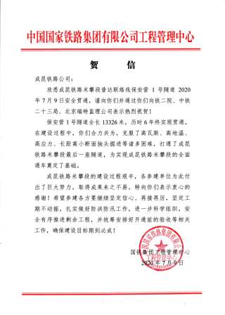 國鐵集團工程管理中心專門發(fā)來賀信,祝賀我公司負責監(jiān)理的成昆鐵路保安營1號隧道(米攀段普達聯(lián)絡線)于2020年7月9日安全貫通,謹向建設單位成都局成昆鐵路公司并轉向參建北京瑞特監(jiān)理公司和設計施工單位表示熱烈祝賀!