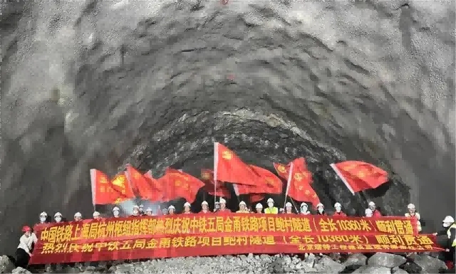 鮑村隧道全長10.36公里,單洞雙線,最大埋深512米,隧道穿越6處斷層破碎帶、9處節(jié)理密集帶及3處巖溶性接觸帶,地質(zhì)復(fù)雜多變,且9處穿越水庫或溪流,施工難度大,開挖風(fēng)險高,參建人員克服隧道涌水量大、高地溫、高地應(yīng)力等諸多困難,確保了隧道安全順利貫通。該隧道的安全順利貫通,標(biāo)志著全線45座隧道全部貫通完成,意味著金甬鐵路建設(shè)取得重大突破。