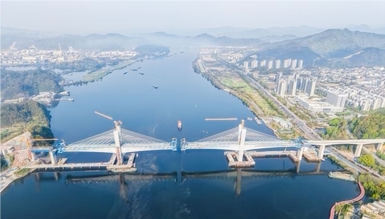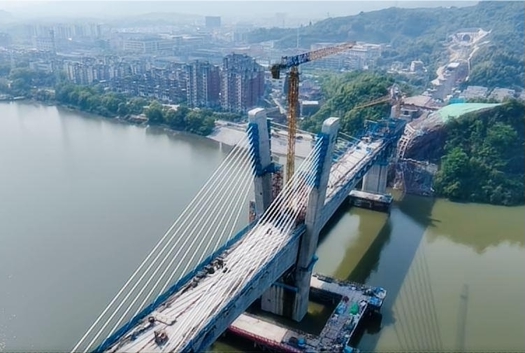 新安江特大橋位于浙江省建德市境內(nèi)該橋全長(zhǎng)885.2米,跨越寬度為520米的江面,采用主跨為216米的矮塔斜拉橋設(shè)計(jì),是目前國(guó)內(nèi)跨度最大的墩塔固結(jié)、塔梁分離式雙塔雙索面半漂浮體系矮塔斜拉橋,技術(shù)難度與施工精度要求極高。大橋共設(shè)4個(gè)主塔,36根斜拉索,最長(zhǎng)索長(zhǎng)達(dá)200米,是金建高鐵重難點(diǎn)工程和標(biāo)志性工程,也是全線施工難度最大的橋梁控制工程,現(xiàn)已完成中跨合龍全橋貫通。